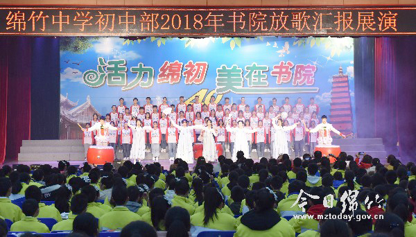 本刊消息 12月20日下午和晚上,绵竹中学初中部以“活力绵初·美在书院”为主题的庆祝改革开放40周年暨2018年书院放歌汇报展演活动在学校演播厅举行。 歌舞《给祖国的一封信》拉开了当天的演出序幕,《如火的青春》、《中国话》、《少年中国说》等17个精彩纷呈的获奖节目轮番上阵,充分展示了学校师生对改革开放40周年的致敬,对伟大祖国发生的巨变致以深情的祝福。据悉,书院放歌汇报展演前,各班、各年级分别开展了校园歌手、器乐、歌舞、钢琴、架子鼓等一系列比赛,全校所有学生都登台参加了表演,参赛人数创历年之最。该校希望通过这样的活动,以加强对学生的美育教育和艺术熏陶,激励师生在新时代的征程中不断进取、勇攀高峰。