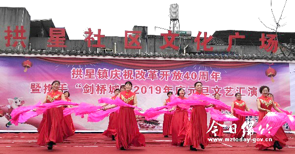 本刊消息 2018年12月27日,由拱星镇主办,绵竹市剑桥城协办的“拱星镇庆祝改革开放40周年暨携手剑桥城2019年庆元旦文艺汇演”在拱星社区文化广场举行。 当天天空虽然下着零星小雨,但依然挡不住大家观看演出的热情。热烈欢快的舞蹈《欢聚一堂》拉开了演出序幕,随后舞蹈《爱我中华》、《高唱红歌跳起来》、小品《致敬改革开放四十周年》、群口相声《颂祖国》等一个个精彩的节目轮番上场。大家通过观看节目,也再次体会到改革开放40年来拱星镇经济社会发生的翻天覆地的变化。