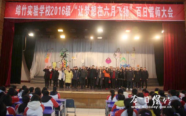3月3日晚上,绵竹实验学校举行初三年级百日冲刺誓师大会,该校14个班、728名初三学生参加了大会。杨俊中老师为学生们献上了一场充满激情的演讲,学生代表孙永翰号召全体同学全力以赴,决战中考,拼搏百日,共创辉煌。