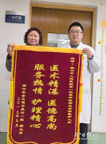 本刊消息 “黄医生,太感谢你了,我儿子当初伤得那么严重现在都能走路了,要不是你们医护人员尽心尽力,他哪能好这么快哦!”近日,一名患者家属将一面锦旗送到华西绵竹医院骨一科,言语中表达着对医护人员的感谢。 今年2月10日,家住金花镇、32岁的蔡先生骑摩托车与一小汽车发生碰撞,造成右股骨、右桡骨粉碎性骨折,右下尺桡关节脱位,全身多处软组织挫伤,被紧急送往华西绵竹医院骨一科抢救。骨一科黄平医生立即对蔡先生进行了手法复位,石膏外固定,同时为了减轻受伤肢体的肿胀,还对其右下肢进行了骨牵引、冰敷。由于蔡先生伤势严重,黄平医生随后为他制定了详细的手术方案,并顺利实施了手术。治疗期间,骨一科护理团队对他精心照顾并进行了心理护理,术后蔡先生肢体功能恢复良好,生活逐渐恢复正常。 看到儿子病情好转,脸上又有了笑容,蔡先生的家人十分高兴,便特意定制了一面写着“医术精湛,医德高尚,服务热情,护理精心”字样的锦旗送到骨一科,以表达全家人对骨一科全体医护人员的信任和感激。