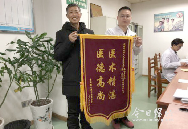 本刊消息 近日,患者张大爷将一面印有“医术精湛 医德高尚”的锦旗送到华西绵竹医院胸外科蒋龙医师手中,感谢胸外科的医护人员高超的医术及住院期间无微不至的关心。 今年72岁的张大爷在1个月前因为在吞食食物时出现梗阻不适来到华西绵竹医院入院就诊为食管癌,需要进行手术治疗。但是张大爷不仅年岁大,而且患有高血压,手术难度大且复杂,住院期间容易出现心脑血管意外等情况。面对这一系列的问题,外三科主任何启明将张大爷作为重点病人。经过科室的反复讨论和精心准备后,由科室副主任医师廖伯勇主刀成功为张大爷实施了食管癌根治术。张大爷手术后恢复良好,目前已经顺利康复出院,出院后张大爷的生活质量得到了大大的提高,为表达感激之情特送来了一面锦旗。 面对这面锦旗,蒋龙医师表示,锦旗虽小,但它不仅代表着患者对医生护士的感谢与认可,更是见证了医生护士高尚的医德与精湛的技术。 据了解,华西绵竹医院虽是基层医院,但胸外科在何启明主任的带领下,紧紧把握学科发展方向,提升自身技术水平,胸腹腔镜联合下食管癌根治术、胸腔镜下肺癌根治术、胸腔镜下纵膈肿瘤手术、胸腔镜下肺大泡切除手术早已成为常规手术,得到了广大患者的信赖和认可,让患者足不出县就能享受到优质的医疗服务,减轻患者的经济负担。