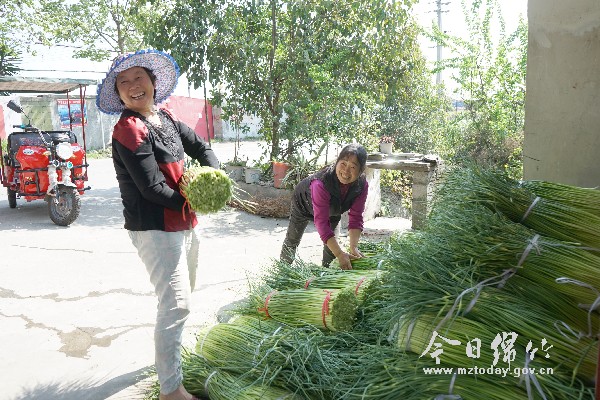 在中新村4组,刘发成正开着装满蒜薹的火三轮奔跑在村道上,“这是今天上午才收的蒜薹,今天已经收了1000斤了,每天跑得简直没时间歇息。”刘发成说,他家今年也种了两亩多蒜薹,这几天家人都在地里忙着采收。
