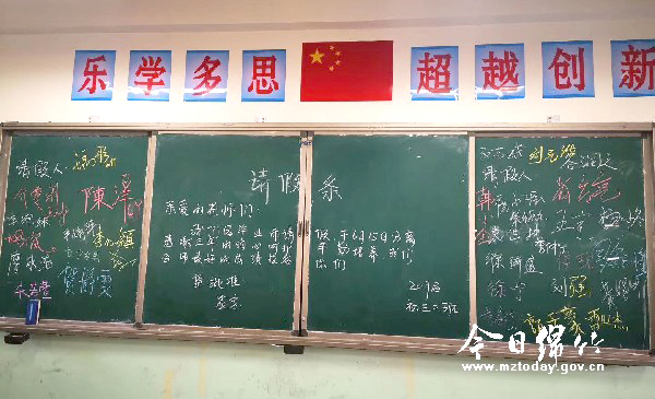 本刊消息 中考,对于即将毕业的初中学生来说意味着即将离开母校,离开悉心栽培自己的老师,离开熟悉的同学各奔东西,然而大家内心有太多回忆、眷恋和不舍。6月12日早上,遵道学校初三(二)班的学生们在教室的黑板上写下“毕业请假条”,感谢老师的无私付出,并表示要以最好的成绩报答老师。 “亲爱的老师们:我们因毕业而请假,于6月15日分离,感谢三年的细心呵护、辛勤培养,我们会用最好的成绩报答你们。望批准。初三二班。”6月12日清晨,推开教室门,黑板上用粉笔书写的“毕业请假条”,让遵道学校初三(二)班班主任余小容忍不住热泪盈眶。12日,是中考第一天,推开教室门余小容本以为会如往年一样见到学生们为即将到来的考试认真准备的身影,却不曾想映入眼帘的却是黑板上特殊的“毕业请假条”以及学生们期待的眼神。“请假条”两侧,不仅全班学生认真签上了自己的名字,其他班级的一些学生也留下了姓名。 “太感动了!”余小容说,三年前开学第一天,我就告诉他们,在学校里,不管是学习还是小情绪,他们所有的一切都与我息息相关。三年来,余小容和同事一起,以行动认真实践着对孩子们的承诺,学生生病,他们细心照顾;学生有了情绪,他们耐心开导。而孩子们也特别乖巧懂事,每每犯错,总会主动找到老师,承认错误,并主动要求惩罚。 随着中考临近,孩子们的不舍情绪愈发浓郁,特别是最近几天,每次下课时,孩子们总是高声齐喊“老师再见!谢谢老师!”并诚挚地90°鞠躬,而老师们也特别舍不得孩子们。余小容说,三年时间,批过太多的假条,而这一次的假条最让她和同事们难忘。当孩子们簇拥她在假条上签字时,她拒绝了,努力平复心情后说,“还要陪你们完成中考,考完后再签!” 余小容告诉记者,“三年相处,有太多不舍,但更多的还是期望!经历中考的洗礼,孩子们应该会成长很多,更加自信、更加自立,希望未来,他们能鹰击长空,拼出自己的精彩,活出自己的style!而老师,会一直在老地方守望着他们,遵道学校永远都是他们的家!”