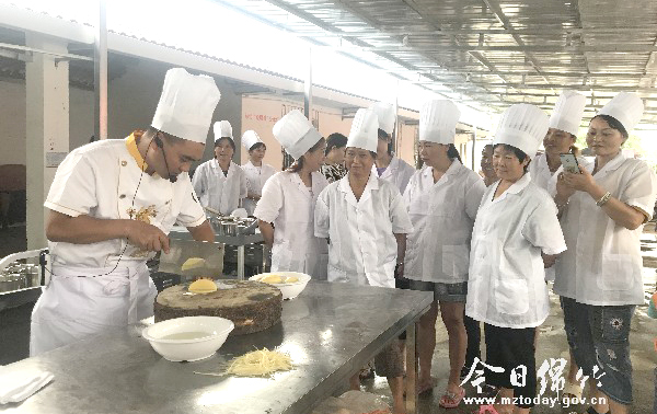 本刊消息 为进一步提高群众的就业技能,扩宽增收渠道,8月5日上午,由市人社局与富新镇共同举办的2019年“特色川菜师”项目制技能培训班开班仪式在富新镇清狮村举行。此次培训班共吸引了该镇40余名厨艺爱好者参加。 记者在现场看到,各种蔬菜肉类摆放整齐,学员们穿着整洁的白色厨师服,站在餐桌前,聚精会神地聆听老师的授课内容。“菜刀要放直,身体稍微前倾,手指弯曲,指头内扣,切菜要讲究厚薄均匀。”此次培训采取理论讲解与实践操作相结合的方式进行,课堂上,来自市职业中专学校授课老师重点讲述了入厨基础知识、烹饪原料的识别、刀工、烹饪技巧、食品卫生等方面知识。培训不仅要求全体学员要熟练掌握特色川菜、小吃等制作方法,更要求学员进一步转变就业职业观念,增强自主创业就业能力,最终达到学有所得,学有所获。 “厨师技能培训的学习,不仅让我们能够多掌握一门技术,做出更美味的饭菜给家人吃,更重要的是多了一条就业渠道,拓宽了自己的致富道路。”参加培训的学员们都非常珍惜学习机会,他们纷纷表示,在为期25天的培训中,将认真听讲,虚心向老师请教,踊跃地参加实际操作。据悉,培训结束后,所有的学员还将进行结业考试,通过考试的学员将获得由市人社局颁发的《绵竹市项目制技能培训》合格证。