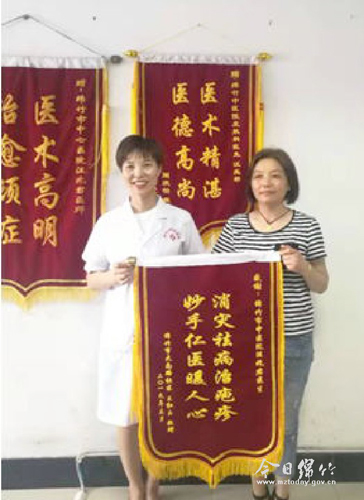 ▲图由市中医医院宣传拓展科提供 本刊消息 8月20日下午,患者王红玉将一面印有“消灾祛病治疱疹 妙手仁医暖人心”字样的锦旗送到了市中医医院皮肤科主任汪兆君手中,以表达自己的感激之情。 据王女士介绍,她由于患有带状疱疹,右侧手臂、前胸及后背出现了大片潮红斑,且很快出现粟粒至黄豆大小的丘疹,疱疹所患之处的皮肤有灼热感,触之有明显的痛觉,在周边各医院辗转就诊,但始终未愈,这令王女士及家人感到十分焦虑及疲惫不堪。后在朋友的介绍下,王女士来到市中医医院皮肤科就诊。皮肤科主任汪兆君在详细了解了王女士的病情后,结合自己多年的临床经验,精准用药,耐心给予健康指导。经过一段时间的治疗,王女士病情得到控制,目前已完全康复。 “这种病的治疗原则为抗病毒、止痛、消炎、营养神经,防止并发症。”汪兆君提醒,一旦发病一定要到正规医院接受治疗,不要相信民间的土方法,以免耽误病情。她表示,除了带状疱疹,其它皮肤病也会对患者的身体和精神造成很大困扰,特别近些年受饮食、气候、环境等多种因素影响,出现很多难治性皮肤病,作为皮肤科医生,要不断学习及更新知识,并在诊疗过程中多给予患者一些关怀,才能更好地为广大患者解除疾苦。