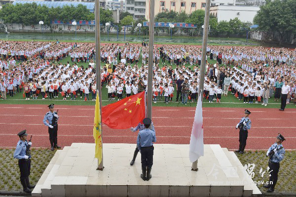 本刊消息 “五星红旗,我为你骄傲!”“国旗,国旗真美丽”……嘹亮的歌声响彻校园。9月3日,紫岩小学2019年秋季开学典礼隆重举行,活动分为“升国旗、唱国旗、讲国旗、成长在鲜艳的五星红旗下”四个篇章。 来自市公安局特警大队的民警为全校师生举行了庄严的升旗仪式。在雄壮的国歌声中,五星红旗冉冉升起,佩戴红领巾的少先队员们举起右手向国旗行注目礼,口中高声吟唱国歌。老师为同学们讲解了五星红旗的内涵和意义,让同学们从小对五星红旗敬仰、对祖国热爱,促进老师不忘初心牢记使命,做爱岗敬业的好老师。全校师生还合唱了歌曲《红旗飘飘》。 当天,公安特警还为同学们展示了擒拿格斗术,并就日常生活中遇到突发情况如何保护自己进行了演示。 紫岩小学目前是一校两区,有2770名学生。该校践行温润教育理念,实行东区优先发展策略,全面推进两区均衡发展。该校在庆祝新中国成立70周年系列活动中,将举行《奔跑吧,紫岩》体育展演展示活动,还将继续开展“问好礼”、“敬好队礼”等活动,同时各年级各班将在本学期围绕“五星红旗,我为你骄傲”主题,开展相关活动。