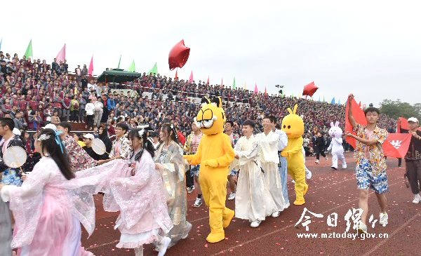 本刊消息 10月23日,绵竹中学第60届体育节开幕,本届体育节为期3天。 开幕式上,同学们广播体操展演后进行的花式表演成为本届体育节的一大亮点。同学们或穿着五颜六色的动物卡通服装行进在校园的跑道上,或跑、或跳、或用文艺的方式演绎体育与艺术的完美结合,各班的花式表演极具特色。本届艺术节上同学们把体育与艺术、政治、历史、文化等有机融合,值得一提的是其中一个班学生将“不忘初心、牢记使命、深化改革、全面小康”等内容写在衣服背面进行展示宣传,极富时代气息。