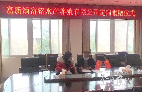 本刊消息 2月26日上午,绵竹市富铭水产养殖有限公司向富新镇捐款1.5万元,定向用于该镇及三泉村疫情防控和脱贫攻坚工作。 据了解,富铭水产养殖公司拟在富新镇三泉村河滩地建设水产养殖农旅生态园。生态园集水产养殖、垂钓、运动、餐饮为一体,计划年产大闸蟹22万斤、青虾5万斤。虽然项目尚未落地,企业却高度关注富新镇的疫情防控及未来发展,希望通过捐款的方式,为该镇疫情防控、脱贫攻坚,尽一份心出一份力。