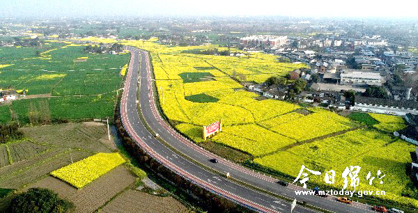 阳春三月,气温回升,我市乡村大地的油菜花竞相绽放,田野间金黄的油菜花、嫩绿的麦苗、蜿蜒的公路和成片的农房组成一幅最美的乡村画卷。图为孝德镇石桥滩村油菜花盛开的场景。