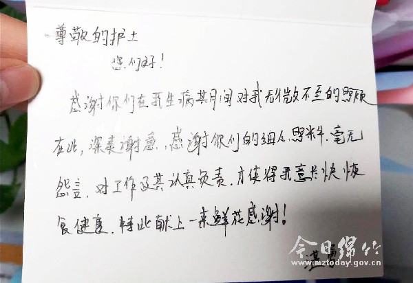 当前,疫情防控工作仍未放松,为确保人民群众生命安全和身体健康,市中医医院全体医护人员始终秉承“服务好、质量好、医德好、群众满意”的理念,为群众构筑起一道生命安全防线,而一面面锦旗、一封封感谢信就是对他们工作的最好认可。 鲜红锦旗表谢意 “手术前,我的生活基本无法自理,翻个身都要人帮忙,现在很多简单的事自己就可以做,真是太感谢骨伤科的老师们了。”近日,该院骨伤科主任伍启军、医生杨小伟及护士长苏清兰收到出院患者李某送来的一面鲜红锦旗。 患者李某今年56岁,因车祸导致腰背部疼痛、活动受限,在成都某医院治疗数日后效果欠佳,于今年2月18日转入市中医医院骨伤科治疗。由于当时正处于疫情防控关键时期,转入后医院对魏某及其家属进行了严格排查,并安排了单间病房进行治疗。 通过详细的检查交流,经过全科讨论,主管医师杨小伟顺利地为李某实施了“经后路腰4椎体骨折撑开复位钉棒内固定术”。术后,科室主任伍启军及医生杨小伟每天都会到病床前耐心地给予功能恢复指导,护士长苏清兰及责任护士魏梦灵轮流给予其术后饮食、用药指导及心理疏导等,让患者心中倍感温暖。 一封感谢信 浓浓医患情 “感谢你们在我生病期间对我无微不至的照顾,在此深表谢意……”近日,一封手写的感谢信及一束鲜花送到了市中医医院外科护士站,字里行间充满了对医护人员的感激之情。 送来感谢信的是患者湛某,因“输尿管结石”于3月10日入院治疗。在其患病期间,外科护理团队想湛某之所想,急湛某之所急,从治疗用药到起居饮食等均给予了无微不至的关心和照顾。为此,患者深受感动,痊愈之时写下了这封感谢信。 “这封温情之‘信’,既是对外科护理工作的肯定,也是对护理团队的一种鞭策。”外科主任杜立先表示,科室全体医护人员将继续努力为患者提供更加满意、放心的医疗服务。