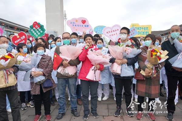 去时正寒风凛冽,归来已春暖花开。4月2日下午,带着家乡人民满满的牵挂和不辱使命、凯旋而归的喜悦,绵竹市第二人民医院呼吸内科护士长张静圆满完成援湖北武汉前线抗疫任务,顺利返绵。亲友、同事以及闻讯而来的父老乡亲自发站在道路两侧,举着印有张静名字的标语,挥舞手中五星红旗,齐声高呼“欢迎回家”! 踏上绵竹的土地 心里一下就踏实了 下午4时许,德阳文庙广场,张静在人群中一眼就看到阔别已久的父母、婆婆、老公和孩子,她抑制不住内心的激动,泪水夺眶而出。“回到亲人身边的感觉真的太好了!”与老公紧紧相拥时,张静已哭成了泪人。44天,终于盼到与亲人团聚,眼泪里满含着诉不尽的深情和幸福,也有成功的喜悦和自豪。其实,披上战袍,她是勇往直前的白衣战士,脱下铠甲,她也有普通人的绕指柔情。 春日里的绵竹,生机盎然,沿途道路两旁,家乡父老挥舞双手高呼“欢迎回家”。紧紧握着老公的手,踏上绵竹的土地,张静心里一下就踏实了许多,感觉沿路的风景甚至拂过脸庞的春风、路过的行人和车辆都是那么的亲切。 44天前,为投身战场,张静毅然剪去长发,如今短发的她更多了一股英气。爱美的张静说,接下来会利用休整时间要好好陪陪家人,还要逛街购物和朋友吃火锅,也特别希望头发能快快长长,自己能重新做回长发美女。 鲜花迎英雄凯旋 她是我们的骄傲 下午6点,在汉旺镇牌坊广场,鲜花簇拥下,张静向自发前来迎接她的父老乡亲深深鞠躬。“2月21日出发,进入武汉市武昌区人民医院,医院收治了500余位患者,其中100余位为重症或危重症患者……我们不辱使命,圆满完成了任务!”在向家乡父老乡亲汇报成绩时,张静几度哽咽,大家以最热烈的掌声表达对她的敬意。 “我是她的老病号了,得知她前往湖北支援抗疫,我很担心她,那么柔弱的一个女娃娃。”汉旺群众曾跃华牵肠挂肚了1个多月,听闻张静凯旋的消息,她叫上亲朋好友,早早赶到广场迎接张静回家。“她是我们的骄傲,是我们的英雄!”田华友说,虽素不相识,但张静不顾个人安危支援湖北抗疫一线,在武汉拼了命守护患者生命的举动太让人感动。现场,还有小女孩为张静送上自己的画作,表达对她的敬意。 “‘管家婆’终于回来了!”“又可以和她一起并肩战斗了!”“静姐,约火锅!”迎接张静的人群中,还有一群手捧鲜花的“白大褂”,他们是张静的同事。“她工作认真严谨,任劳任怨,对我们又特别照顾,她是我们科室的‘管家婆’、‘主心骨’”除了点赞,鲜花簇拥中,同事们一一与张静深情拥抱。