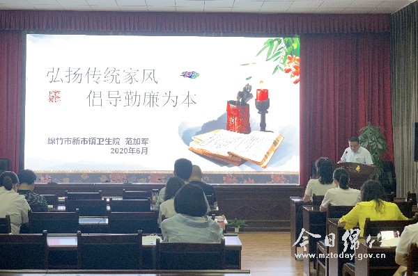 6月22日下午,新市镇卫生院召开了加强清廉文化建设,助推“五个一”全覆盖警示教育为主题的系列活动。 “什么是家风?家风有什么用?家风如何传?”在当天的《弘扬传承家风,倡导勤廉为本》主题家风讲堂中,该院副院长范加军讲解了家规家训家风的古今意义,阐述了培养良好家风的重要性。随后,全体党员聆听了“严守党纪国法,坚持廉洁行医”主题党课,集中观看了疫情防控先进典型事迹《幸得有你,民安泰来》以及警示教育片《青山何以现阴霾》,并进行了廉洁书画作品展示、评选,进一步营造了清正廉洁的浓厚氛围。 (图由医院提供)