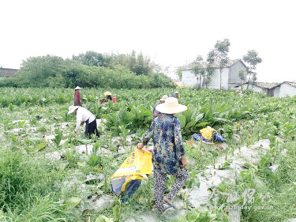 7月21日早上7点,天空中下起了小雨,家住剑南街道五星村十组的张华兵赶忙戴上草帽,披着雨衣,快步来到田间晒场,拉开晾晒架上的黑色胶布,仔细查看胶布下的每一片叶烟是否被雨淋湿。看到叶烟依旧干燥如初,他大大地松了一口气。“这批叶烟已经晾晒了两周左右了,这时候千万不能沾水,否则容易影响叶烟的成色。”张华兵说道。 今年73岁的张华兵是五星村建档立卡贫困户,儿子因智力低下和眼睛残疾失去劳动力,全家人仅靠张华兵外出打零工维持生计。叶烟种植基地建好后,在村干部的召集下,张华兵成为一名田间管理人员,搭架、覆膜、种烟、割烟、看守晒场,随处可见他忙碌的身影。“如今一天能挣到80元,一个月最少都能增收2000余元,既能照顾家里,又能改善生活条件,日子真是越过越好了。”张华兵告诉记者,通过在基地工作,他看到了叶烟种植的优势,也学到了种植技术,明年他也想在自家的地里种上一两亩叶烟,希望能够以此脱贫致富。 上午10点,记者来到剑南街道五星村叶烟种植基地看到,田里的叶烟已经基本收割完毕,目前正是叶烟晾晒的季节。经过十多天的晾晒,晒场上的叶烟已经蒸发掉大部分水分,没有了往日的清脆欲滴,卷曲的烟叶像被着上了一层黄色,显得格外“成熟”。晒场上,村民们忙碌不停将架上的叶烟取下,整整齐齐地码在一起,装袋、称重,等待烟草生产企业前来收购。“我们年龄大了,外出打工没人要,多亏了村上的叶烟基地,让我在家门口也能拿到两份收入。”67岁的贫困户刘光会将家里的田全部流转给合作社,带着身患残疾的女儿在烟地里务工,日子渐渐有了起色。 五星村党支部书记付尧海告诉记者,为进一步抓好产业发展,壮大集体经济,激活贫困户“自我造血”功能,2019年11月,五星村村集体合作社流转土地20余亩,在帮扶单位绵竹市烟草公司种子、技术的支持下,成立叶烟扶贫种植基地,带动20余户建档立卡贫困户通过土地流转、劳务用工、以田入股等方式加入合作社,享受土地租金+务工收入+保底分红,走出了“支部+合作社+贫困户”的产业扶贫新路子。2020年,叶烟种植基地共收获1万余斤叶烟,带动该村贫困户户均增收5000元左右,村集体收入达到8万元左右。 (图片由五星村提供)