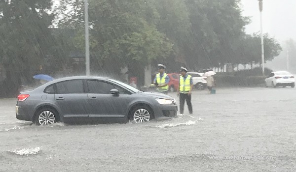 “暴雨中执勤,绵竹交警好样的!”8月11日上午,一组交警在暴雨中坚守的照片在朋友圈刷屏,不少网友纷纷留言点赞。 当天上午9点,电闪雷鸣,暴雨倾盆而下,不少驾驶员因着急上班而插队的现象不时发生,加上电动车、摩托车在车流间来回穿梭,导致不少路段发生严重交通拥堵。在大南路水果市场附近,市交警大队城市中队辅警贺少琦、陈文正冒雨在路面来回执勤。“这边积水了,不能通过。”此时,暴雨越下越大,他们并未携带雨衣,任由暴雨侵袭,继续边吹哨、边扯着嗓子开展工作,不少等待通行的驾驶员纷纷拿出手机拍下这感人一幕。 “交通局门口积水严重,一辆私家车通过时熄火了,赶紧去帮忙。”听到对讲机里的声音后,贺少奇和陈文连忙赶往现场,只见车辆轮胎已被淹没,驾驶员在车里十分着急。“不着急,我们帮你推车。”两人用力推车,车辆成功启动。驾驶员打开车窗,向两人竖起大拇指表示感谢。 上午9点半,南轩中学附近的雨水已漫过小腿,此时,一位老年人正准备过马路。“婆婆,水深得很,我背你吧。”担心老人在途中不慎摔倒,陈文立即背起老人,正在执勤的贺少奇也赶紧奔跑过来,将雨伞撑到老人的头顶。“群众的安全最重要,交警冒雨执勤是常有的事,这里就是我们的阵地,这就是我们的责任。”面对大家的点赞,两人淡淡地说。本刊记者 周韵 文/图 主动作为 紧急转移群众
