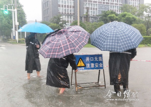 强降雨导致城区多处出现积水,20余个井盖冒顶,双忠路、南轩路、南京大道、玉妃路、回澜大道等多条道路积水严重,道路通行受阻。暴雨发生后,市综合执法局迅速行动,全员应战,兵分多路坚守到各处积水点排危。 上午9点30分,玉妃路二段大蓉和酒店附近的路面积水最深处超过了20厘米,冒顶的下水道口前已设立警示标牌,来往车辆减速缓行。上午10点过,回澜大道市公安局附近的路面已经拉起了多处警戒线,市综合执法局工作人员坚守在暴雨中指挥交通,劝导驾驶员小心绕行。 据市综合执法局工作人员介绍,暴雨发生后,该局针对城区险情点多面广的情况,组织起多支抗洪抢险小分队,深入城区内低洼地带、易积水区域、行人密集路段等进行应急抢险救灾。抢险小分队队员对各积水地段和冒顶下水道口进行警戒守护;对积水较深淹没路段进行拉线警示,指挥车辆行人避开险地;对能及时排险的积水路段,第一时间对下水道进行疏通、抽水。同时,该局园林所、路灯所全体工作人员也分散到各条道路上开展巡查,确保行道树发生倒伏、路灯线路出现安全隐患时第一时间排险除危。 本刊记者 刘菲 文/图