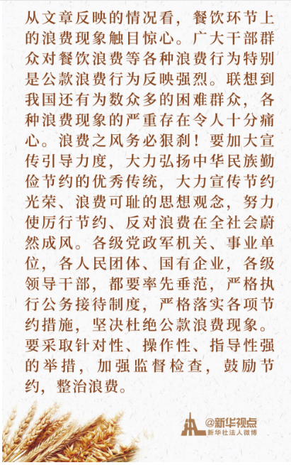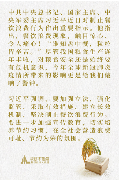 “谁知盘中餐,粒粒皆辛苦。”习近平总书记引用古诗,道出每一粒粮食都来之不易。 经历过穷苦日子,从“吃不饱、饿肚子”的岁月走过来的习近平,对珍惜粮食有着刻骨铭心的体会。 在中央农村工作会议上,他曾讲过这样一件事:媒体报道,一所大学食堂的垃圾桶里经常有白花花的馒头和米饭,清洁工看着心痛,捡起来再吃。总书记语重心长地告诫大家,“即使生活一天天好了,也没有任何权利浪费!”。 那么,下一步该怎么办?总书记从两个层面提出了要求。 一是“建立长效机制”。 从2013年之后,习近平总书记多次作出指示,突出强调刚性的制度约束、严格的制度执行、强有力的监督检查、严厉的惩戒机制…… 这一次则进一步强调,“要加强立法,强化监管,采取有效措施,建立长效机制,坚决制止餐饮浪费行为。”这是从更高层次上为餐饮浪费立下根本之法。 二是“加强宣传教育”。 对于餐桌上的浪费现象,习近平总书记曾指出,这与社会上存在的讲面子、讲排场的陋习有关。 这次特别要求“要进一步加强宣传教育,切实培养节约习惯,在全社会营造浪费可耻、节约为荣的氛围”,目的就是要在全社会的粮食观念上来一次破旧立新的变革,重拾“节俭”情怀,树立“粮食是一种紧缺资源”的爱粮、节粮新观念,让节约粮食成为永久的习惯和风气。