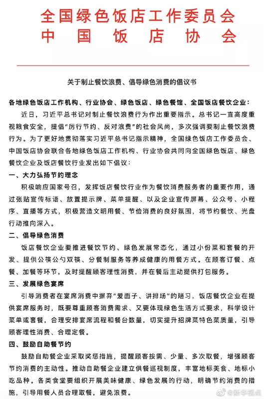 8月13日,中国饭店协会发表《关于制止餐饮浪费、倡导绿色消费的倡议书》,提出饭店餐饮企业要推进餐饮节约、绿色发展常态化,通过小份菜和套餐的开发、提供公筷公勺双筷、分餐制服务等养成健康的用餐方式。