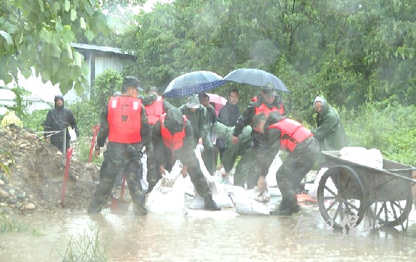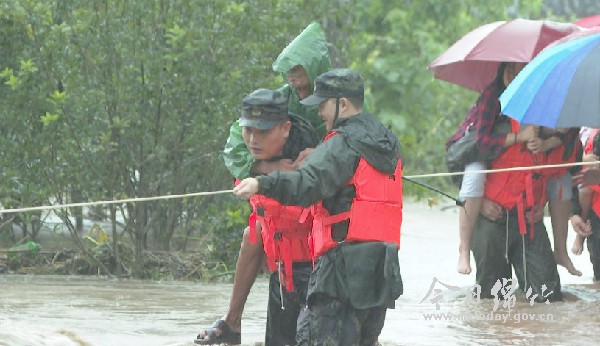 受“8·15”特大暴雨影响,16日凌晨3点左右,马尾河孝德段、射水河孝德段河水陡涨,导致孝德镇境内不少农房发生内涝,农田被淹。 “3点过10分的时候就开始涨水了,农田全部被淹了,我们房子也进水了。”当地村民唐朝碧告诉记者,由于马尾河孝德镇洪拱村段水位上涨,很快就蔓延到了农田,到3点10分左右,周围的农房也开始进水。得知情况后,孝德镇第一时间组织村组干部和派出所民警前往受灾最严重的洪拱村4组转移群众。之后,武警德阳支队的官兵也带着冲锋舟来到该村,和村组干部、民警一道合力转移受灾群众。“稳到稳到,手松了,我抬到在...你让他坐到你身上。”考虑到老年人行动不便,官兵们将老人抬到冲锋舟上进行转移,小孩和其他行动不便的群众则由村组干部和民警背着转移。 “我们社区14组的农房基本上都进水了,现在转移出来100多人。”齐福社区副书记李汝军告诉记者,凌晨2点左右,射水河水位陡涨,不断冲向下游,村民的房子也因此全部进水,积水最深的时候水位已经达到了1米。“现在水流湍急,还大概有10个人没有转移出来,其中还包括一些行动不便的老年人,所以我们打算把牵引绳绑到柱子上,让可以行走的群众拉到牵引绳转移出来,行动不便的老年人我们就一个一个背出来。”武警德阳支队政治处副主任张少坤一边忙着将牵引绳拉紧,一边嘱咐官兵们注意受困群众的安全。 与此同时,由于射水河水位上涨导致该镇桐麻村1组的观堰水位持续上涨,原来的河堤被洪水淹没,并且有将近5米左右的河堤已经被洪水冲垮。在河堤的一边,武警德阳支队的官兵们正忙着装填砂袋,用砂袋堵住观堰的河堤与田埂,以免河水继续漫延。 上午10点半,在武警官兵和村组干部的共同努力下,成功利用砂袋筑成的挡水墙,将观堰漫过河堤的水引向河中,确保了河堤不再受损。
