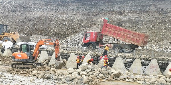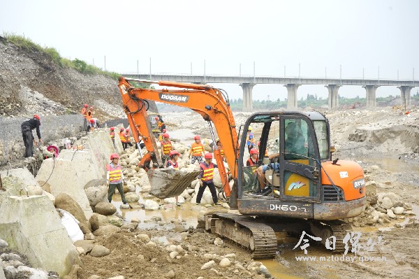 本刊消息 8月11日至8月16日的多次强降雨,导致我市绵远河、石亭江、射水河、马尾河等沿线多处河堤受到不同程度的损毁,威胁着沿河企业生产安全和群众的生命财产安全。洪峰过后,市委、市政府高度重视,第一时间安排部署水毁河堤修复工作,市水利局、交通局等部门紧急动员,迅速到位,抢抓晴好天气,在水毁河堤沿岸筑起“安全屏障”。目前,各项水毁项目应急修复工作正有序推进。 8月21日下午,记者在货运大道绵远河盘龙化建段看到,左侧河岸200米防洪堤被洪水冲毁,货运大道部分路面悬空,旁边一段堤岸也出现了大裂缝。数十台大型挖掘机伸出长长的铁臂,对河道中淤积的砂石进行清除,多辆大型工程运输车来回穿梭。施工人员带着安全帽,扎进砂石堆里,往整齐摆放的钢筋笼里放置鹅卵石,对水毁河堤进行抢修加固。 “施工队伍于8月19日进场,工人们正加班加点抢修。”众力工程机械设备有限公司项目经理周洪兵介绍,目前此项应急修复工程已完成了40%。由于主汛期还未结束,建成临时堤埂旨在减轻下次洪水再次对受损河堤的冲击力度,避免发生决堤,确保两岸村民生命财产安全。 8月21日下午,在马尾河高新区一号桥段,工作人员忙着加固河堤,大型机具对河心岛进行疏通,整个工程正加速推进。据市水利局工作人员刘钟毅介绍,在“8·16”特大暴雨中,此段河堤被冲毁,目前施工队伍正在对河心岛进行疏通,河岸一侧的水毁河堤已经用吨袋筑起了临时堤防。 当天下午5点,记者在射水河孝德镇桐麻村官堰看到,岸上,火花四射,好几名电焊工正在赶制钢筋笼;河里,机械轰鸣,十几名工人相互配合忙着填充砂袋、固定钢筋笼,一条新建的临时河堤已初具模型。 “这段水毁河堤严重威胁周边村民和农田,目前必须抢抓时间,做好河堤的应急除险。”金申建筑公司副总程宗伟告诉记者,险情发生后,金申建筑公司与市水利局对接,迅速启动抗洪抢险预案,调来挖机、车辆、铁铲、吨袋等救援器材,赶赴现场开展河堤修复加固工作,预计此段河道应急修复工程将于8月24日完成。 记者了解到,在“8·16”特大暴雨中,造成绵远河、射水河、石亭江、马尾河等多处河堤受损,其中12处水毁严重。险情发生后,市委、市政府高度重视,多次召开防汛减灾工作会议,安排部署排危除险工作,市水利局、交通局协调人力物力资源,成立技术指导组、安全监督组、现场负责组,与众力工程机械设备有限公司、金申建筑有限公司打好配合战,组织精兵强将在货运大道绵远河盘龙化建段、年画村跑马场、马尾河高新区一号桥段、汉旺镇绵远河楠木沟等12处河道同步推进应急排危除险工程,确保在下一轮强降雨天气来临前完成河道疏浚和河堤临时修复工作任务,切实消除安全隐患。
