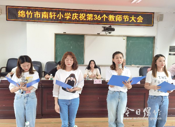 本刊消息 9月10下午,南轩小学举行教师节庆祝活动,表彰了一年来在教学、科研、管理各方面取得优异成绩的教职工先进集体和个人,全体教师签订了师德师风承诺书。学生代表表演诗朗诵《教师礼赞》、歌曲《感恩》,向全体教师致敬;青年教师现场还进行献诗表演,抒发了大家对教育事业的热爱之情。