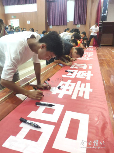本刊消息 9月11日上午,由绵竹市禁毒办和汉旺镇党委、政府主办的“小手拉大手 禁毒齐步走”宣传教育活动在汉旺温州加园栋梁中学举行。 活动现场,相关人员运用近年来群众身边发生的涉毒典型案例以案说法,详细讲解了什么是毒品和合成毒品,深刻剖析了毒品的巨大危害,告诫同学们警惕吸毒陷阱,不要轻易进入娱乐场所,提醒大家要热爱生活,加强体育锻炼,珍惜生命,抵制诱惑,远离毒品,遵守国家禁毒法律法规,做一名合格的青少年。 授课结束后,参加活动的人员分别在“珍爱生命、远离毒品”的禁毒横幅上签名并宣誓。现场嘉宾还为同学们发放了禁毒承诺书。