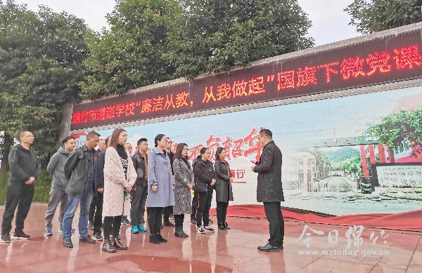 本刊消息 11月5日,遵道学校举行了“国旗下微党课”活动,学校党支部书记、校长俞华平作题为《廉洁从教,从我做起》的国旗下微党课。据悉,该校将把“国旗下微党课”这一活动打造成为遵道学校党建工作和主题教育的一个特色品牌。 据了解,“国旗下微党课”是遵道学校党建工作和主题教育的一种新的教育形式,也是提升全体教育人素质形象的一项新举措。全体教育工作者在“升旗后”“国旗下”这个特定的时空场景里聆听党课,感悟到作为一名党员、一名教育工作者身上的责任和义务,进而将这种感悟转化为做一名合格党员、一个优秀教育工作者的动力,立足本职岗位,以务实的态度,勤奋的精神,廉洁的作风投入到教育事业的洪流中,用博爱为学生撑起广阔的蓝天,做家长和学生心中那朵圣洁的莲花。 当天,国旗下微党课以后,俞华平希望全体教师要树立正确的职业道德观和幸福观,发扬奉献精神,淡泊名利,不利用职务之便谋取私利,廉洁从教;要用真心去爱学生,公平公正地对待每一位学生,因材施教;要坚持清廉自守,自觉抵制各种非正当利益的诱惑。