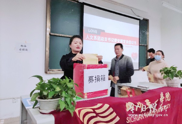 本刊消息 11月17日,四川天一学院人文与艺术设计系举行“爱在人文,感恩有你”募捐活动启动仪式。 此次募捐是为绵竹被单戏非遗传人陈远立发起,此前,老人曾在该校为师生表演被单戏。今年4月,陈远立老人突感不适,背痛牙痛,咳血,症状长时间没有减轻,辗转各大医院检查后被诊断为肺癌。 扶危济困,奉献爱心。天一学院人文与艺术系发起倡议,期望广大师生伸出援助之手,传递一份生命的热度,帮忙陈远立老先生战胜病魔。 当天,200余名师生参加了募捐活动的启动仪式,大家在《爱的奉献》音乐声中踊跃捐款,短短半小时捐赠金额就达到了7000余元。虽然与巨额医疗费用相比还相差很远,但这代表着全体师生的爱心和真情,由衷表达了广大师生对陈远立老人的祝福。