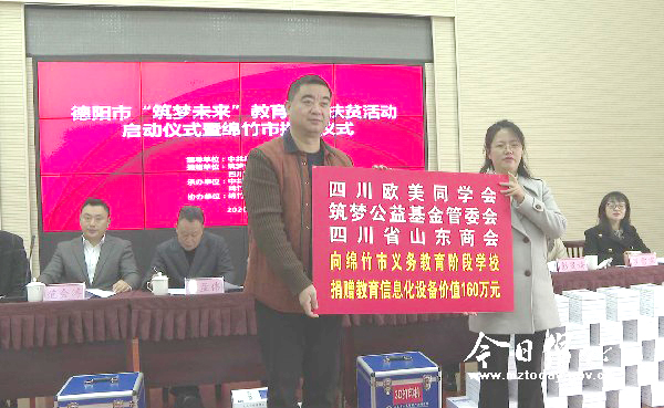 本刊消息 12月3日上午,德阳市委统战部、绵竹市委统战部、绵竹市教育局联合中国初级卫生保健基金会筑梦公益基金管委会在大西街小学开展了“筑梦未来”教育精准扶贫活动。德阳市委统战部常务副部长、市台办主任、市侨办主任王孟伟,德阳市委统战部副部长杨兆红,绵竹市委常委、市政协党组副书记、市委统战部部长曾学武,市委常委、副市长曾鹏,中国初级卫生保健基金会筑梦公益基金管委会常务副主任、四川省山东商会常务副会长范会涛参加捐赠仪式。 仪式上,筑梦公益基金管委会向我市教育局进行物资移交,杨兆红为筑梦公益基金管委会颁发荣誉证书。此次筑梦公益基金管委会向我市捐赠了学生用平板电脑、绘画工具和3D打印机总计约160余万元。 曾学武代表市委、市政府对给予本次捐赠活动大力支持和帮助的四川欧美同学会、筑梦公益基金管委会和德阳市委统战部表示感谢。他说,此次“筑梦未来”教育精准扶贫活动,将助力绵竹教育信息化发展,推进信息技术与教育教学深度融合。捐赠物资将携着无私大爱,普惠绵竹万千学子,为孩子们的未来筑梦。