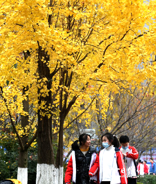 金色银杏叶为冬日校园增彩