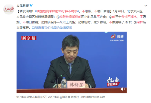 1月26日,北京大兴区人民政府副区长韩新星提醒:①核酸检测采样前两小时尽量不进食;②前三十分钟不喝水、不吸烟、不嚼口香糖;③排队保持一米以上间距;④临检时,减少吞咽,不做清嗓子动作;⑤采样后立即离开。