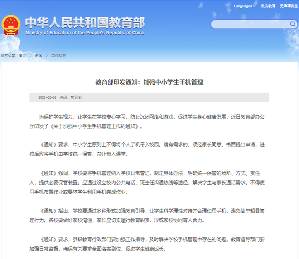 教育部:中小学生原则上不得将个人手机带入校园