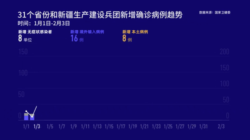 2月3日0—24时,31个省(自治区、直辖市)和新疆生产建设兵团报告新增确诊病例30例,其中境外输入病例13例(北京5例,福建3例,广东3例,上海2例),本土病例17例(吉林8例,黑龙江4例,上海3例,河北2例);无新增死亡病例;新增疑似病例1例,为境外输入病例(在上海)。 当日新增治愈出院病例135例,解除医学观察的密切接触者2816人,重症病例较前一日减少17例。 境外输入现有确诊病例304例(其中重症病例5例),现有疑似病例1例。累计确诊病例4758例,累计治愈出院病例4454例,无死亡病例。 截至2月3日24时,据31个省(自治区、直辖市)和新疆生产建设兵团报告,现有确诊病例1411例(其中重症病例49例),累计治愈出院病例83602例,累计死亡病例4636例,累计报告确诊病例89649例,现有疑似病例1例。累计追踪到密切接触者968773人,尚在医学观察的密切接触者34184人。 31个省(自治区、直辖市)和新疆生产建设兵团报告新增无症状感染者12例(境外输入11例);当日转为确诊病例6例(无境外输入);当日解除医学观察47例(境外输入13例);尚在医学观察无症状感染者788例(境外输入277例)。 累计收到港澳台地区通报确诊病例11494例。其中,香港特别行政区10530例(出院9633例,死亡185例),澳门特别行政区47例(出院46例),台湾地区917例(出院834例,死亡8例)。