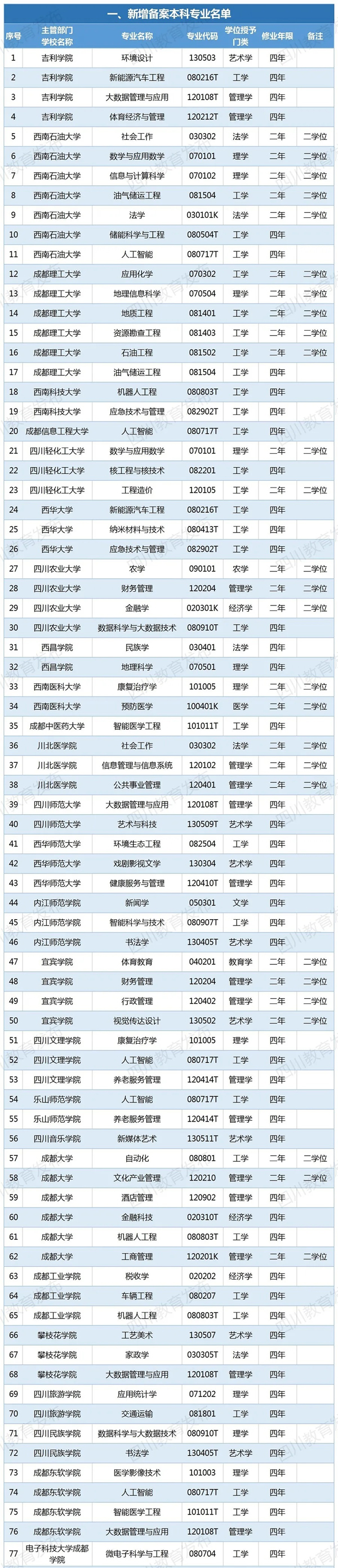 3月1日,教育部印发《关于公布2020年度普通高等学校本科专业备案和审批结果的通知》,确定了同意设置的国家控制布点专业和尚未列入专业目录的新专业名单,公布2020年度普通高等学校本科专业备案和审批结果并更新普通高等学校本科专业目录。 其中,四川新增备案本科专业110个,新增审批本科专业4个,调整学位授予门类或修业年限的专业1个,撤销本科专业17个。 2020年度普通高等学校本科专业备案和审批结果(四川)