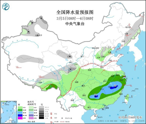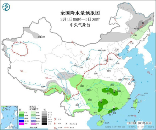 预计今天(3月4日),全国降水格局变化不大,南方阴雨范围有所扩展。明天,南方降水增强,部分地区有暴雨,同时江南南部到华南沿海地区伴有强对流天气,这将是今年以来南方首轮大范围的对流天气过程,需注意防范。 南方降水增强部分地区有暴雨 首轮大范围对流天气来袭