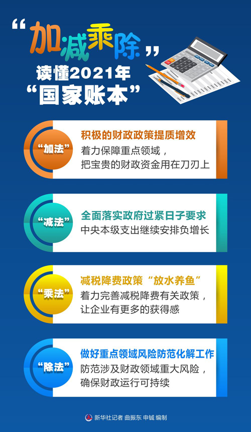“加法”:积极的财政政策提质增效 “一竿子插到底”的财政资金直达机制迎来扩围。政府工作报告提出,建立常态化财政资金直达机制并扩大范围,将2.8万亿元中央财政资金纳入直达机制、规模明显大于去年,为市县基层惠企利民提供更加及时有力的财力支持。 基本实现中央财政民生补助资金全覆盖——根据预算报告,今年,将直接用于基层财力保障的一般性转移支付、年初可直接分配的中央和地方共同财政事权转移支付、具备条件的专项转移支付纳入直达机制范围。 “要增强绩效意识,使直达资金下得快、管得严、用得准,让市场主体和群众切实受益。”全国人大代表、安徽省财政厅厅长罗建国说。 财政支出方面,今年全国一般公共预算支出安排超过25万亿元,增长1.8%。 中央本级基础研究支出增长10.6%;中央财政就业补助资金安排559亿元,增加20亿元;进一步提高企业职工基本养老保险基金中央调剂比例至4.5%……预算报告中的一组数据,彰显财政加大对重点领域的支持力度。 在全国政协委员、中国财政科学研究院院长刘尚希看来,今年财政政策提质增效指向明显,着力保障重点领域,把宝贵的财政资金用在刀刃上。 “减法”:全面落实政府过紧日子要求 过紧日子,是近年财政运行的一大特点,也是今年预算报告中的关键词。 根据预算报告,中央本级支出继续安排负增长,进一步大幅压减非急需非刚性支出,重点项目和政策性补贴也按照从严从紧、能压则压的原则审核安排。 “中央本级财政支出连续两年负增长,节省的资金用于增加对地方的转移支付。今年中央对地方的转移支付比去年略有增加,规模超过8.3万亿元。”在今年两会首场“部长通道”上,财政部部长刘昆为大家算了一笔账。 “乘法”:减税降费政策“放水养鱼” 延续执行企业研发费用加计扣除75%政策,将制造业企业加计扣除比例进一步提高到100%;将小规模纳税人增值税起征点从月销售额10万元提高到15万元;取消港口建设费……多项新鲜出炉的政策,将为市场主体再省下“真金白银”。 “减税降费有效落实,实实在在减轻了企业经营负担。以研发费用加计扣除为例,这项优惠政策给企业带来更多资金‘活水’,并进一步转化为创新‘春水’,发挥乘数效应,增加企业发展活力。”全国人大代表、江苏金昇实业股份有限公司董事长潘雪平说。 近年来,我国实施了大规模减税降费政策,助力市场主体轻装上阵。尤其是2020年,面对严峻复杂形势,在财政收支比较困难的情况下,我国持续公布实施了7批28项减税降费政策,新增减税降费规模超2.6万亿元。 “今年将着力完善减税降费有关政策,让企业有更多的获得感。”刘昆说,各级财政部门将算大账、算长远账,克服眼前收支压力,坚决把该减的税减到位,把该降的费降到位。 “除法”:做好重点领域风险防范化解工作 面对仍然复杂严峻的国内外形势,防范涉及财政领域重大风险,确保财政运行可持续,尤为关键。 今年的预算报告中,一些指标进行了适度调整,旨在进一步加强财政运行的可持续性。例如,今年的赤字率、新增地方政府专项债券限额比2020年有所降低,但仍高于2019年。 “这些安排调控精准、不急转弯,把握好了政策时度效。”全国人大代表、广东省财政厅厅长戴运龙表示,整体来看,今年的财政政策保持了连续性、稳定性,兼顾稳增长和防风险需要。 给地方政府债务戴上“紧箍咒”,经济社会发展就多一道“安全阀”。预算报告明确,加强地方政府债务管理,抓实化解地方政府隐性债务风险工作。 “我们正在加强县级债务风险管控,指导帮助县级财政缓解债务偿付压力,守住地方政府债务风险防控的底线。”全国人大代表、云南省财政厅厅长张岩松说。