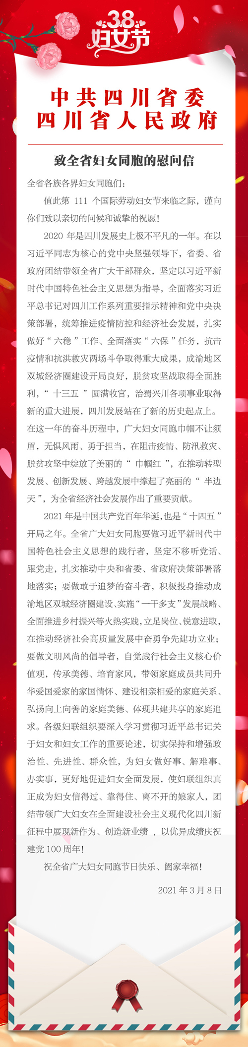 全省各族各界妇女同胞们: 值此第111个国际劳动妇女节来临之际,谨向你们致以亲切的问候和诚挚的祝愿! 2020年是四川发展史上极不平凡的一年。在以习近平同志为核心的党中央坚强领导下,省委、省政府团结带领全省广大干部群众,坚定以习近平新时代中国特色社会主义思想为指导,全面落实习近平总书记对四川工作系列重要指示精神和党中央决策部署,统筹推进疫情防控和经济社会发展,扎实做好“六稳”工作、全面落实“六保”任务,抗击疫情和抗洪救灾两场斗争取得重大成果,成渝地区双城经济圈建设开局良好,脱贫攻坚战取得全面胜利,“十三五”圆满收官,治蜀兴川各项事业取得新的重大进展,四川发展站在了新的历史起点上。在这一年的奋斗历程中,广大妇女同胞巾帼不让须眉,无惧风雨、勇于担当,在阻击疫情、防汛救灾、脱贫攻坚中绽放了美丽的“巾帼红”,在推动转型发展、创新发展、跨越发展中撑起了亮丽的“半边天”,为全省经济社会发展作出了重要贡献。 2021年是中国共产党百年华诞,也是“十四五”开局之年。全省广大妇女同胞要做习近平新时代中国特色社会主义思想的践行者,坚定不移听党话、跟党走,扎实推动中央和省委、省政府决策部署落地落实;要做敢于追梦的奋斗者,积极投身推动成渝地区双城经济圈建设、实施“一干多支”发展战略、全面推进乡村振兴等火热实践,立足岗位、锐意进取,在推动经济社会高质量发展中奋勇争先建功立业;要做文明风尚的倡导者,自觉践行社会主义核心价值观,传承美德、培育家风,带领家庭成员共同升华爱国爱家的家国情怀、建设相亲相爱的家庭关系、弘扬向上向善的家庭美德、体现共建共享的家庭追求。各级妇联组织要深入学习贯彻习近平总书记关于妇女和妇女工作的重要论述,切实保持和增强政治性、先进性、群众性,为妇女做好事、解难事、办实事,更好地促进妇女全面发展,使妇联组织真正成为妇女信得过、靠得住、离不开的娘家人,团结带领广大妇女在全面建设社会主义现代化四川新征程中展现新作为、创造新业绩,以优异成绩庆祝建党100周年! 祝全省广大妇女同胞节日快乐、阖家幸福!