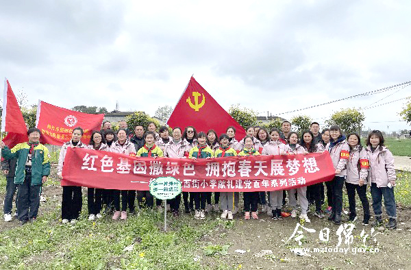 本刊消息 3月8日,大西街小学开展了“红色基因撒绿色 拥抱春天展梦想”献礼建党百年系列活动。 上午8点30分,伴随着雄壮的国歌声,鲜艳的五星红旗在校园冉冉升起,拉开了活动的序幕。国旗下,党员教师罗怡鸣以《清澈的爱 只为中国》为题,向全校师生分享了红色故事,让爱国主义教育走进童心、深入童心。 随后,学校组织党员、教师代表和少先队干部代表深入剑南街道柏杨村开展植树活动。学生们还走进村民家中,积极宣传垃圾分类知识,号召大家秉持环保理念,为绵竹生态环境贡献一份力量。