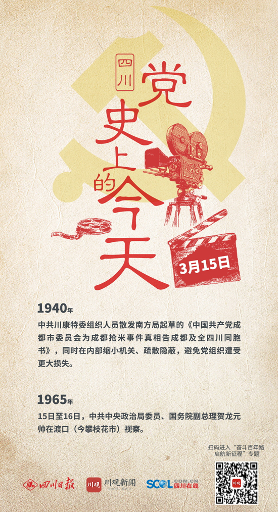 1940年 中共川康特委组织人员散发南方局起草的《中国共产党成都市委员会为成都抢米事件真相告成都及全四川同胞书》,同时在内部缩小机关、疏散隐蔽,避免党组织遭受更大损失。 1965年 15日至16日,中共中央政治局委员、国务院副总理贺龙元帅在渡口(今攀枝花市)视察。
