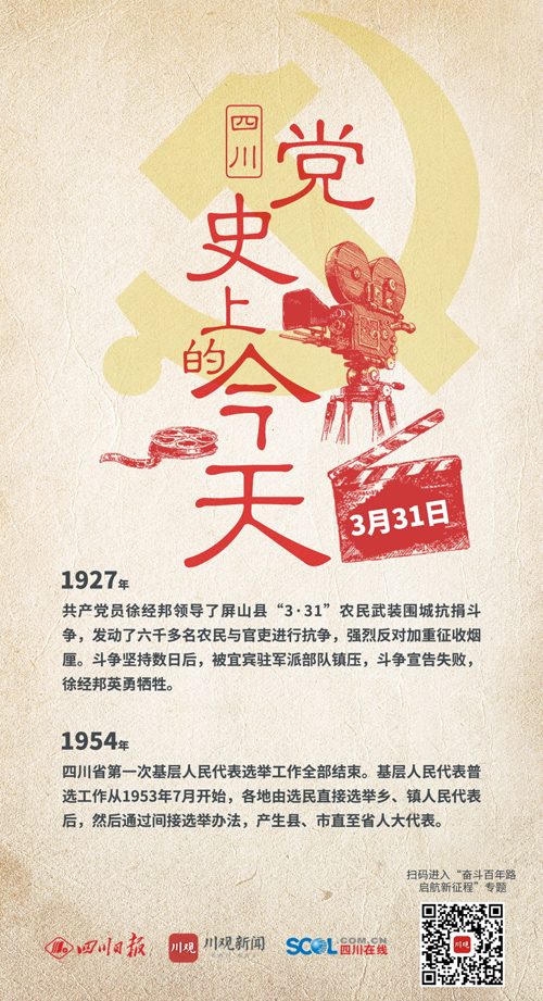 1927年 共产党员徐经邦领导了屏山县“3·31”农民武装围城抗捐斗争,发动了六千多名农民与官吏进行抗争,强烈反对加重征收烟厘。斗争坚持数日后,被宜宾驻军派部队镇压,斗争宣告失败,徐经邦英勇牺牲。 1954年 四川省第一次基层人民代表选举工作全部结束。基层人民代表普选工作从1953年7月开始,各地由选民直接选举乡、镇人民代表后,然后通过间接选举办法,产生县、市直至省人大代表。
