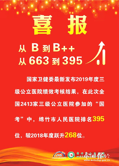 本刊消息 3月30日,国家卫健委召开三级公立医院绩效考核工作视频会议,正式发布2019年度三级公立医院绩效考核结果。在此次全国2413家三级公立医院参加的“国考”中,绵竹市人民医院排名第395名,评定为B++等级,较2018年度排名663名的国考成绩跃升268名。