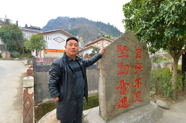 石光武站在家门口刻有“自强不息 坚韧奋进”的石碑前。(唐续宗摄)