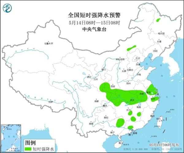 中央气象台5月14日06时继续发布强对流天气蓝色预警: 预计5月14日08时至15日08时,内蒙古南部、陕西中南部、河南南部、安徽中南部、江苏中南部、上海北部、湖北北部和西部、江西北部、浙江北部等地的部分地区将有8-10级雷暴大风或冰雹天气;内蒙古中部、黑龙江西北部、河南南部、安徽中南部、江苏中南部、上海北部、湖北、湖南北部、江西北部和南部、浙江北部、四川盆地东北部、重庆东北部、广西东北部、广东中部和西北部等地的部分地区将有短时强降水天气,小时雨强20-50毫米,局地可达70毫米以上。 预计,强对流的主要影响时段为今天午后至夜间。