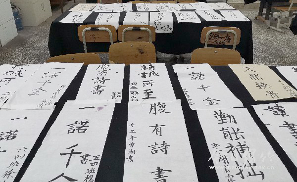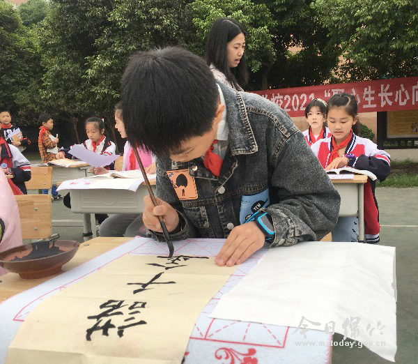 在比赛现场,四至六年级和二、三年级的学生分别以软笔、硬笔书写为主参与比赛,学子们自由选择语文书中的文章认真书写,语文老师现场指导,《神州谣》抒发了令人动容的民族情谊,《囊萤夜读》则体现了新市学子牢记刻苦二字。