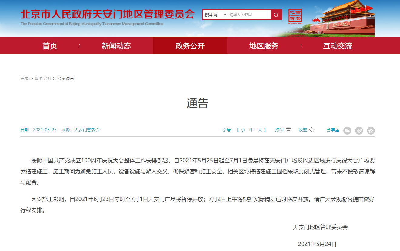 近日,天安门地区管理委员会发布通告:按照中国共产党成立100周年庆祝大会整体工作安排部署,自2021年5月25日起至7月1日凌晨将在天安门广场及周边区域进行庆祝大会广场要素搭建施工。施工期间为避免施工人员、设备设施与游人交叉,确保游客和施工安全,相关区域将搭建施工围挡采取封闭式管理,带来不便敬请谅解与配合。 因受施工影响,自2021年6月23日零时至7月1日天安门广场将暂停开放;7月2日上午将根据实际情况适时恢复开放。请广大参观游客提前做好行程安排。