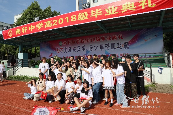 毕业典礼上,全体高三学子为感谢母校的培养,自愿捐款,以年级的名义购买纪念树,种在校园内,祝愿母校越来越好。班牌交接仪式将典礼推向高潮。高二各班班长接过班牌,让“勤学报国”的南轩精神在一届届南轩学子中传递、延续、升华。最后,高三学子按班级顺序奔向“龙门”。毕业典礼在轻松的氛围中圆满落幕。