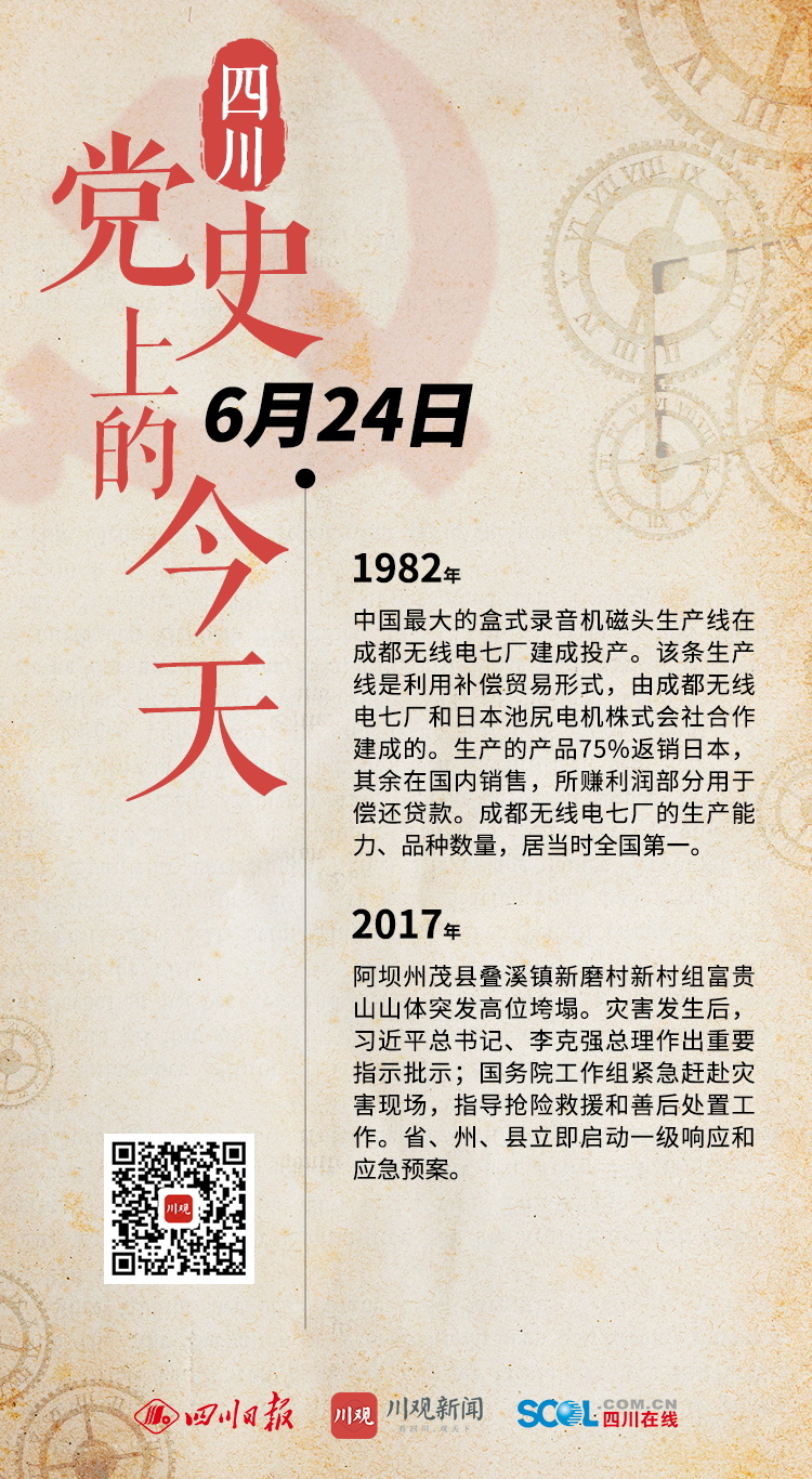 1982年 中国最大的盒式录音机磁头生产线在成都无线电七厂建成投产。该条生产线是利用补偿贸易形式,由成都无线电七厂和日本池尻电机株式会社合作建成的。生产的产品75%返销日本,其余在国内销售,所赚利润部分用于偿还贷款。成都无线电七厂的生产能力、品种数量,居当时全国第一。 2017年 阿坝州茂县叠溪镇新磨村新村组富贵山山体突发高位垮塌。灾害发生后,习近平总书记、李克强总理作出重要指示批示;国务院工作组紧急赶赴灾害现场,指导抢险救援和善后处置工作。省、州、县立即启动一级响应和应急预案。