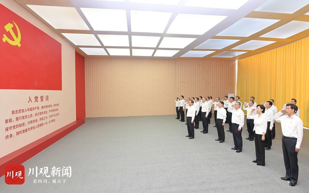 随后,大家步入展厅参观展览。展览以时间为纲,分为“浴血奋战换新天”“艰辛探索创伟业”“伟大变革铸辉煌”“民族复兴谱新篇”4个展区,用1200余张历史图片和400余件实物,再现了各个历史时期共产党人在四川不忘初心、砥砺前行的伟大实践和推动巴蜀大地发生的历史性巨变。四川第一份宣传马克思主义的刊物照片、各族人民支援红军长征的统计表、开国大典同厂话筒、成渝铁路文物、原广汉县向阳乡在全国率先摘下“人民公社”牌子的场景、易地扶贫搬迁沙盘、陈列的系列改革成果……这些生动影像、珍贵文物、详实资料、逼真场景,吸引了大家的目光。他们认真听取讲解,不时驻足观看,详细询问了解有关情况,并相互交流参观心得体会。 参观结束后,省级党员领导同志步行至宣誓厅,在彭清华带领下集体重温入党誓词。大家面向鲜红的中国共产党党旗,郑重举起右拳,庄严的宣誓声响彻大厅,让在场每位同志都接受了一次深刻的党性教育和思想洗礼。
