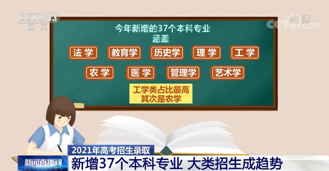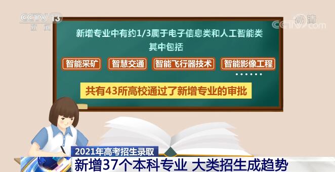 央视网消息:眼下,各地高考成绩已经陆续公布,考生进入志愿填报的关键阶段。根据教育部公布的2021年高校招生专业目录,今年新增了37个本科专业。同时,记者发现,高校按照学科大类招生已成为一种趋势,各高校还积极推行本科生全员导师制。一起来看一看。 今年新增的37个本科专业涵盖法学、教育学、历史学、理学、工学、农学、医学、管理学、艺术学九大门类,其中,工学类占比最高,其次是农学。新增专业中有约三分之一属于电子信息类和人工智能类,其中包括智能采矿、智慧交通、智能飞行器技术、智能影像工程等。共有43所高校通过了新增专业的审批。