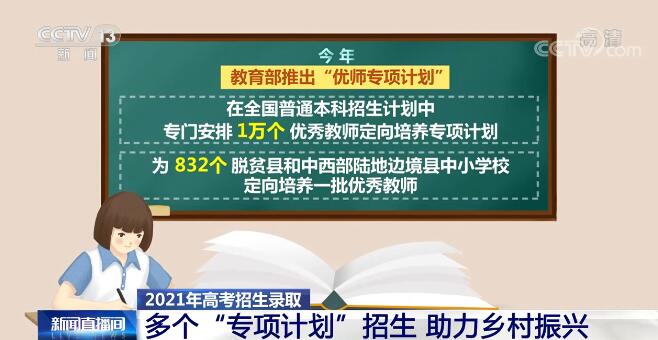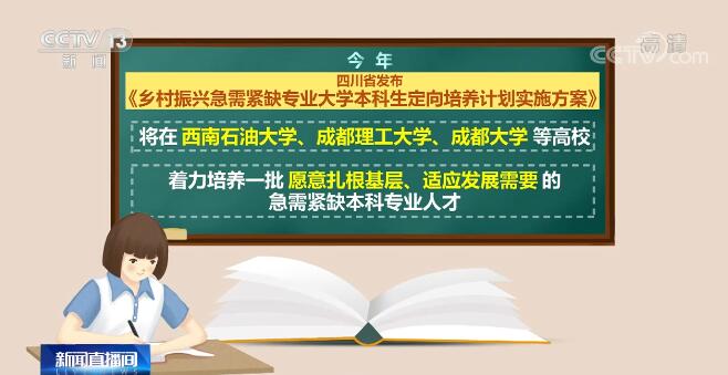 今年,教育部推出“优师专项计划”,在全国普通本科招生计划中专门安排1万个优秀教师定向培养专项计划,为832个脱贫县和中西部陆地边境县中小学校定向培养一批优秀教师。其中,地方“优师专项”由有关省份统筹地方师范院校招收,国家“优师专项”由6所部属师范大学承担,今年将招收1000名专业师范生。 今年,四川省发布《乡村振兴急需紧缺专业大学本科生定向培养计划实施方案》,将在西南石油大学、成都理工大学、成都大学等高校着力培养一批愿意扎根基层、适应发展需要的急需紧缺本科专业人才。招生对象为四川省88个脱贫县的高考考生,招生录取采取单设批次、单独录取的方式,招生规模预计1000名左右。