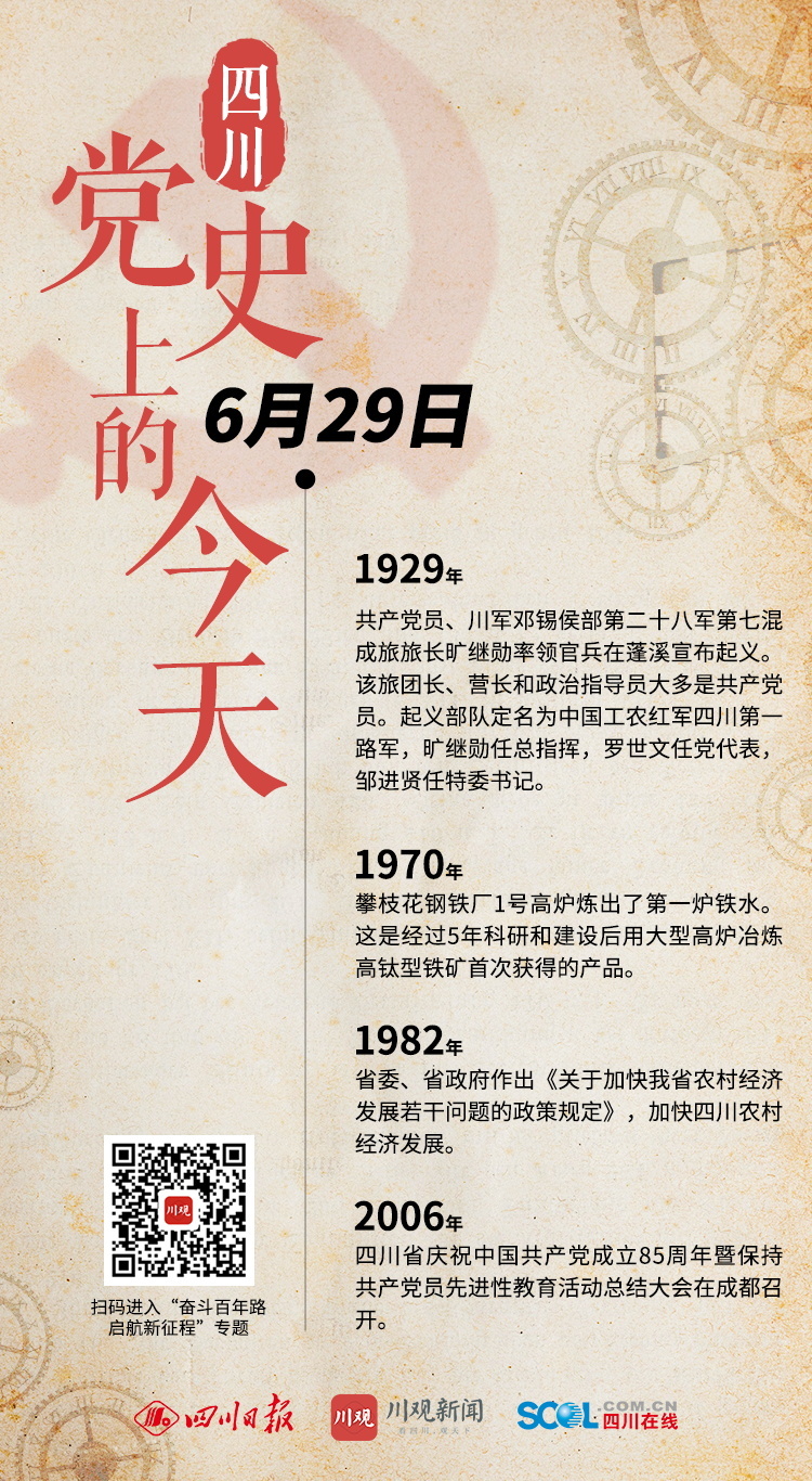 1929年 共产党员、川军邓锡侯部第二十八军第七混成旅旅长旷继勋率领官兵在蓬溪宣布起义。该旅团长、营长和政治指导员大多是共产党员。起义部队定名为中国工农红军四川第一路军,旷继勋任总指挥,罗世文任党代表,邹进贤任特委书记。 1970年 攀枝花钢铁厂1号高炉炼出了第一炉铁水。这是经过5年科研和建设后用大型高炉冶炼高钛型铁矿首次获得的产品。 1982年 省委、省政府作出《关于加快我省农村经济发展若干问题的政策规定》,加快四川农村经济发展。 2006年 四川省庆祝中国共产党成立85周年暨保持共产党员先进性教育活动总结大会在成都召开。 (川观新闻记者 袁婧 整理)